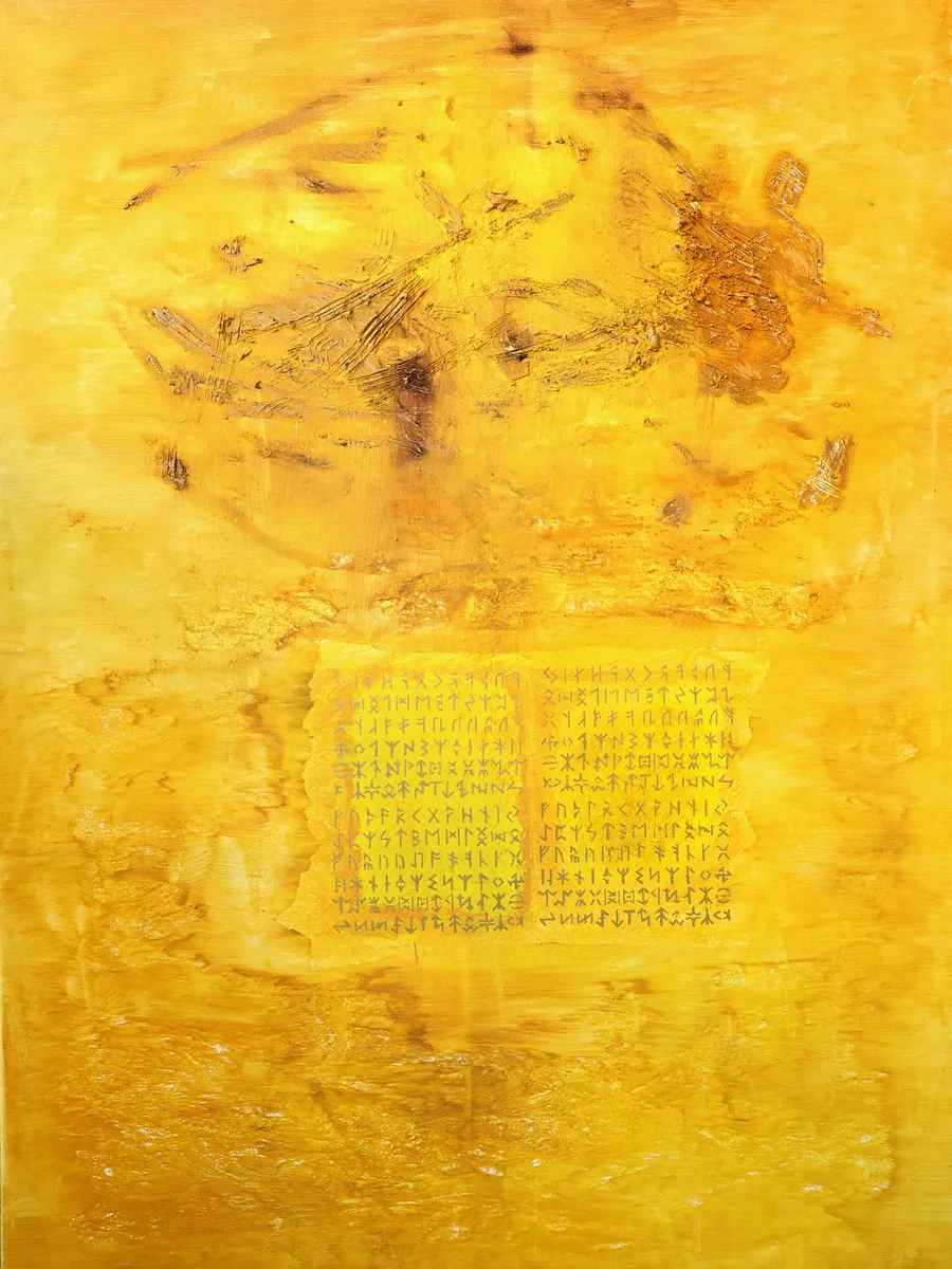 Old runes draws the viewer into a warm, inviting landscape of golden and yellow hues that feel both luminous and textured. At its core lies a carefully arranged grid of rune-like characters, each symbol etched with precision and rhythm. This structured block anchors the composition, suggesting ancient language or secret messages waiting to be uncovered. Above it, an abstract form sweeps across the surface with fluid, gestural lines and soft smudges, hinting at motion or transformation. The blending of these elements creates a balance between order and spontaneity, evoking a timeless story woven through an atmosphere charged with quiet mystery. The artwork invites reflection on history, symbolism, and the quiet power of form and color working in concert.