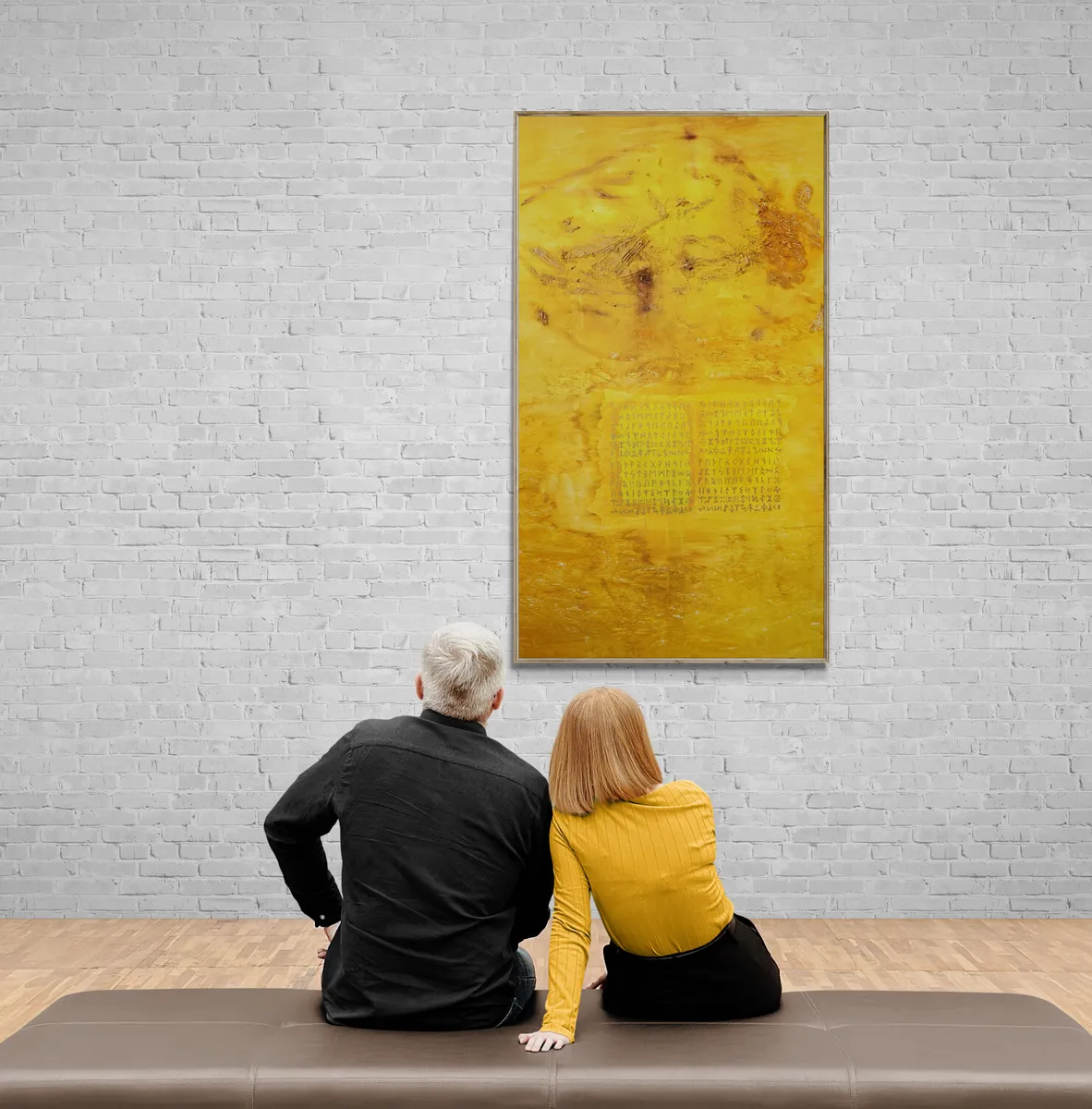 Old runes draws the viewer into a warm, inviting landscape of golden and yellow hues that feel both luminous and textured. At its core lies a carefully arranged grid of rune-like characters, each symbol etched with precision and rhythm. This structured block anchors the composition, suggesting ancient language or secret messages waiting to be uncovered. Above it, an abstract form sweeps across the surface with fluid, gestural lines and soft smudges, hinting at motion or transformation. The blending of these elements creates a balance between order and spontaneity, evoking a timeless story woven through an atmosphere charged with quiet mystery. The artwork invites reflection on history, symbolism, and the quiet power of form and color working in concert.