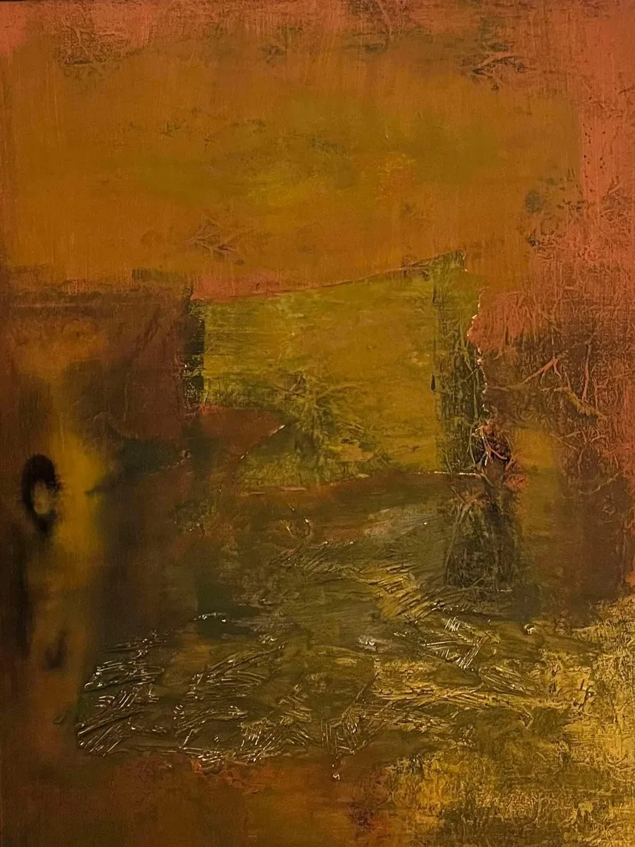 This artwork is an abstract composition featuring a blend of earthy tones, primarily deep ochre, olive green, and rusty orange. The piece includes a variety of textured layers and brushstrokes, creating a sense of depth and movement. The colors merge and contrast, bringing out a dynamic yet harmonious balance. Textured patterns in the foreground suggest an organic or natural element, contributing to the abstract nature of the painting.