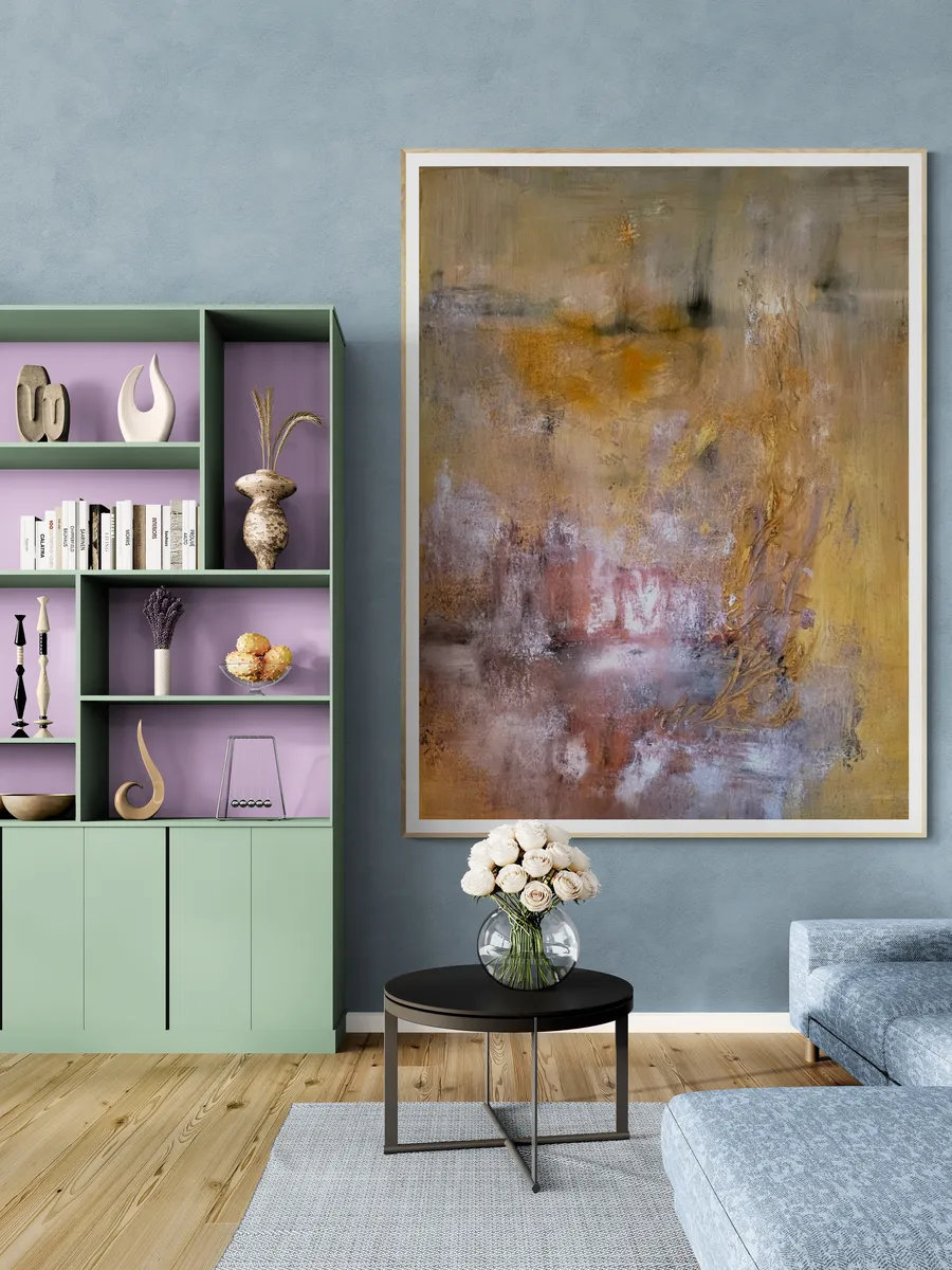 Behold an enigmatic creation, where earthy tones intertwine in an abstract dance of color and form. The canvas whispers tales of autumnal landscapes, as dominant hues of yellow, ochre, and muted purples coalesce in a vibrant symphony. The artist's brushstrokes, textured and layered, weave a tapestry of depth and movement, inviting the viewer into a realm where perception is both challenged and enchanted. In this mystical tableau, areas of darker shades punctuate the composition, casting shadows that enhance the rich, dynamic elements. Luminous hints of soft white flicker like ethereal whispers, bringing to life an energy that is both grounded and transcendent. The flowing, organic nature of the piece evokes a sense of natural elements, as if the very essence of the earth itself has been captured and reimagined on the canvas. This artwork, titled "September," holds an aura of mystery, beckoning the observer to delve into its layers and uncover the secrets held within. It is a world of its own, where contrasts harmonize and the subtle interplay of color inspires a sense of wonder and curiosity.