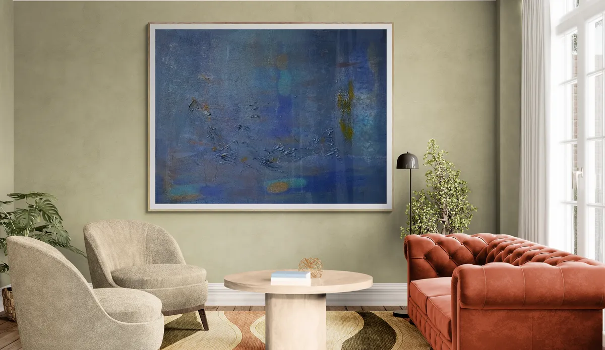 The artwork is an abstract painting characterized by a rich, textured surface predominantly in shades of blue and subtle hints of contrasting colors like yellow and aqua. The composition features layered brushstrokes and intricate textures that create a dynamic and immersive visual experience. The use of color and texture suggests depth and movement, engaging the viewer in an exploration of its abstract forms.