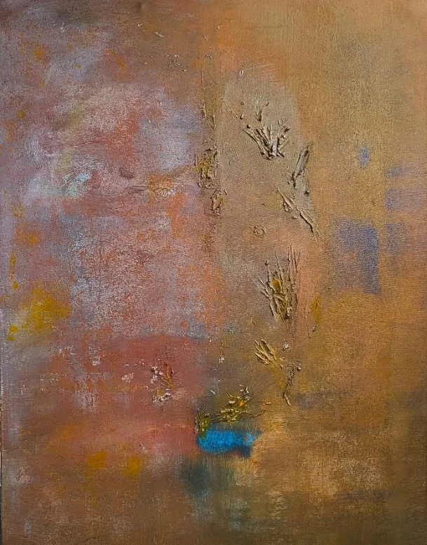 This artwork is an abstract painting dominated by warm earth tones and a palette of soft, blended colors. Textured elements are scattered throughout the canvas, adding dimension and depth. The background consists of muted shades of brown, ochre, and hints of dusty pink, with small areas of brighter color, including a section of vibrant blue near the bottom. The textured details, resembling organic forms, provide a subtle contrast against the smoother background, creating a balanced interplay between color and texture.
