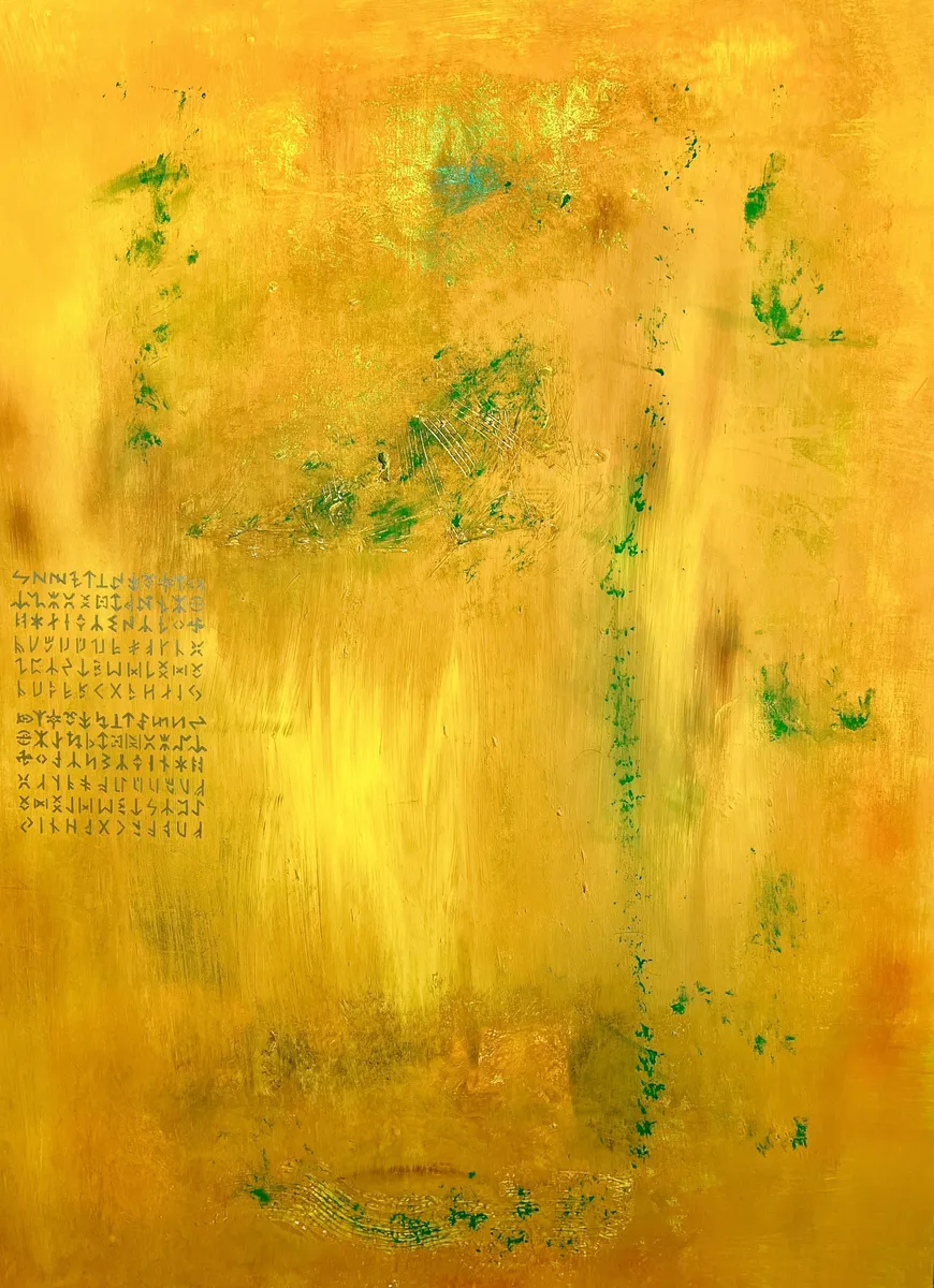 The artwork is an abstract painting dominated by a vibrant yellow background. It features subtle green accents scattered across the canvas in an irregular pattern. The composition is minimal, focusing on the interplay of yellow and green, with some faint textural elements adding depth and interest to the piece.