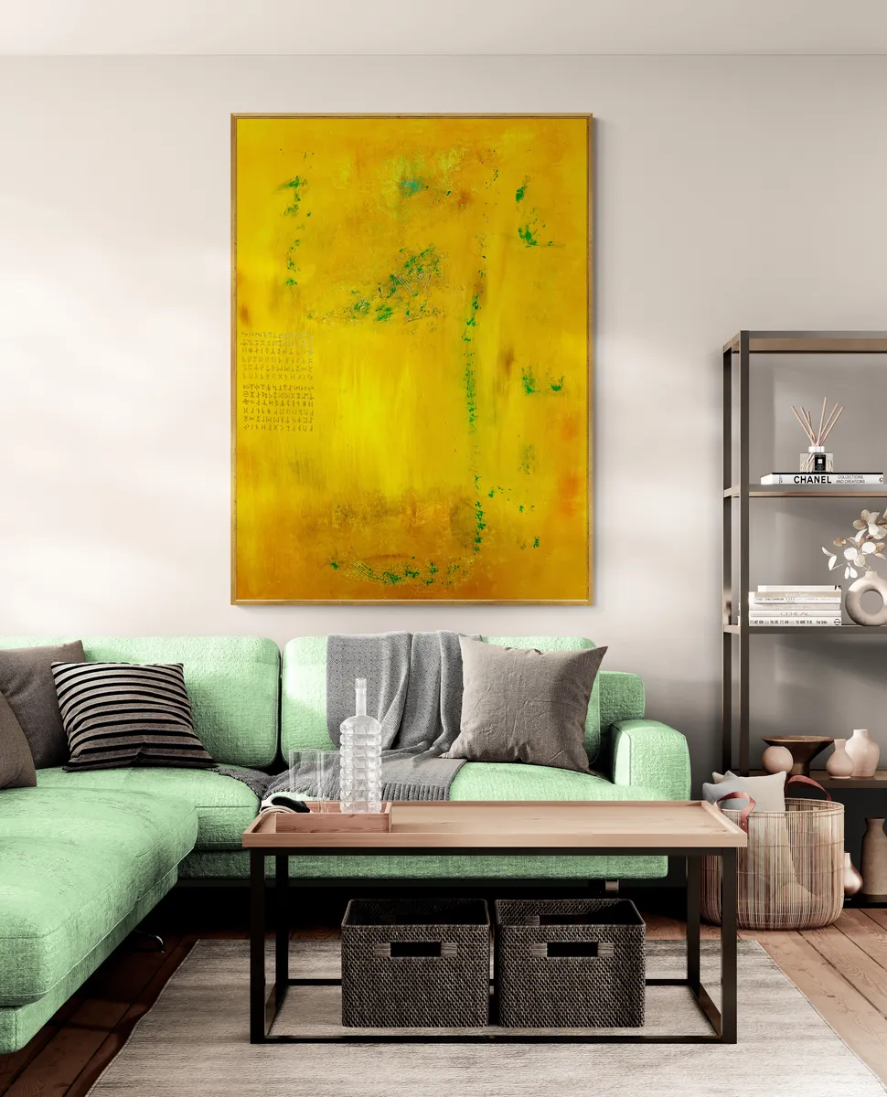 The artwork is an abstract painting dominated by a vibrant yellow background. It features subtle green accents scattered across the canvas in an irregular pattern. The composition is minimal, focusing on the interplay of yellow and green, with some faint textural elements adding depth and interest to the piece.