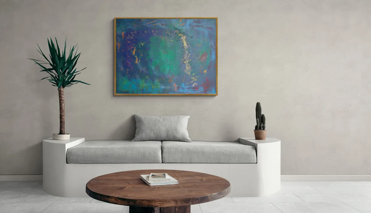 The artwork is an abstract painting dominated by vibrant blues, greens, and purples. It features textured strokes and areas of bright, contrasting colors, such as hints of orange and red. The layers and brushwork create a sense of depth and movement throughout the composition.