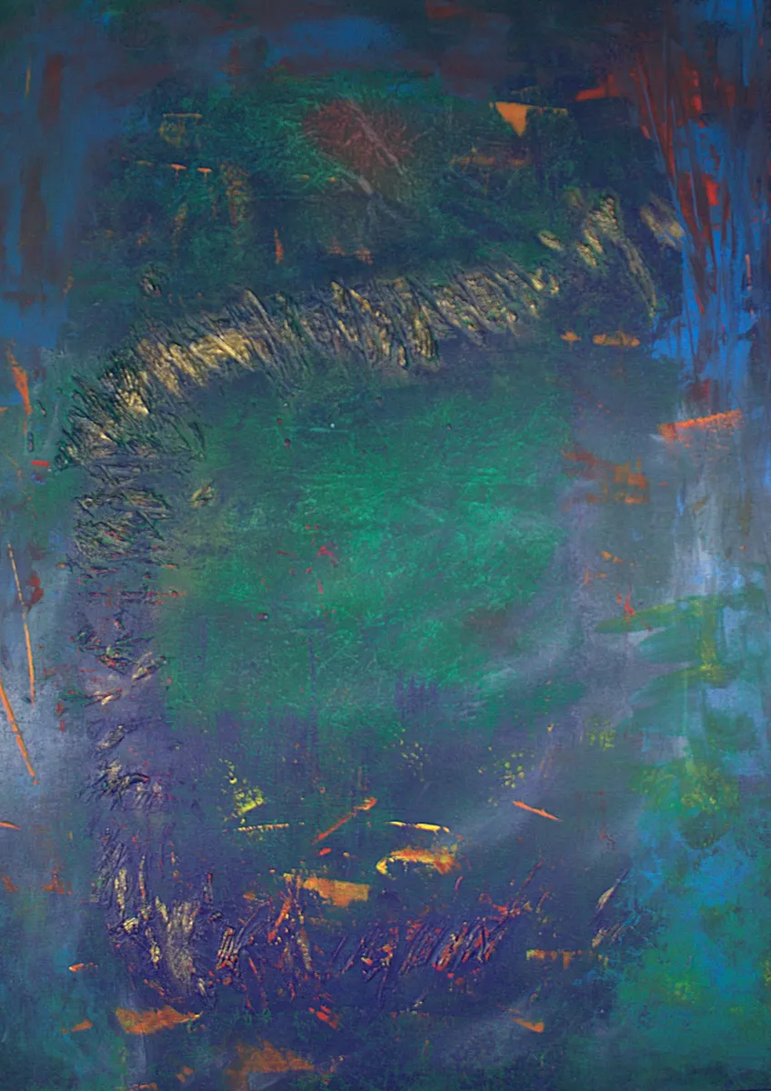 In "Gold in Blue," a realm of profound mystery and transcendent beauty emerges—a celestial tableau where deep blue and verdant green form the fertile soil of imagination. A symphony of hues dances across the canvas, each brushstroke a conductor of an invisible orchestra, pulling viewers into a contemplative silence where movement and color declare their harmony. The painting exudes a captivating allure, as swirling textures give voice to an otherworldly dimension where shadows and light engage in an eternal dialogue. Hints of orange and red punctuate this tranquil expanse, like embers in the darkness, sparking curiosity and deepening the intrigue of this intricate tapestry. It is a landscape untamed by time, inviting the viewer to explore its labyrinthine folds and discover whispers of dreams yet unspoken. As one's gaze is drawn further into this mystic domain, the experience becomes immersive—a call to venture beyond superficial sight and into a realm where the subtleties of existence whisper their secrets. The interwoven layers appear alive, whispering rites of passage for those who dare to lose themselves in their textured embrace. "Gold in Blue" speaks in soft tongues, offering a poetic reflection on the invisible threads that weave the fabric of reality, a narrative unscripted yet profoundly felt. Here lies an invitation to the soul's migration to a place where reality blurs, and the beauty of infinite possibility begins.