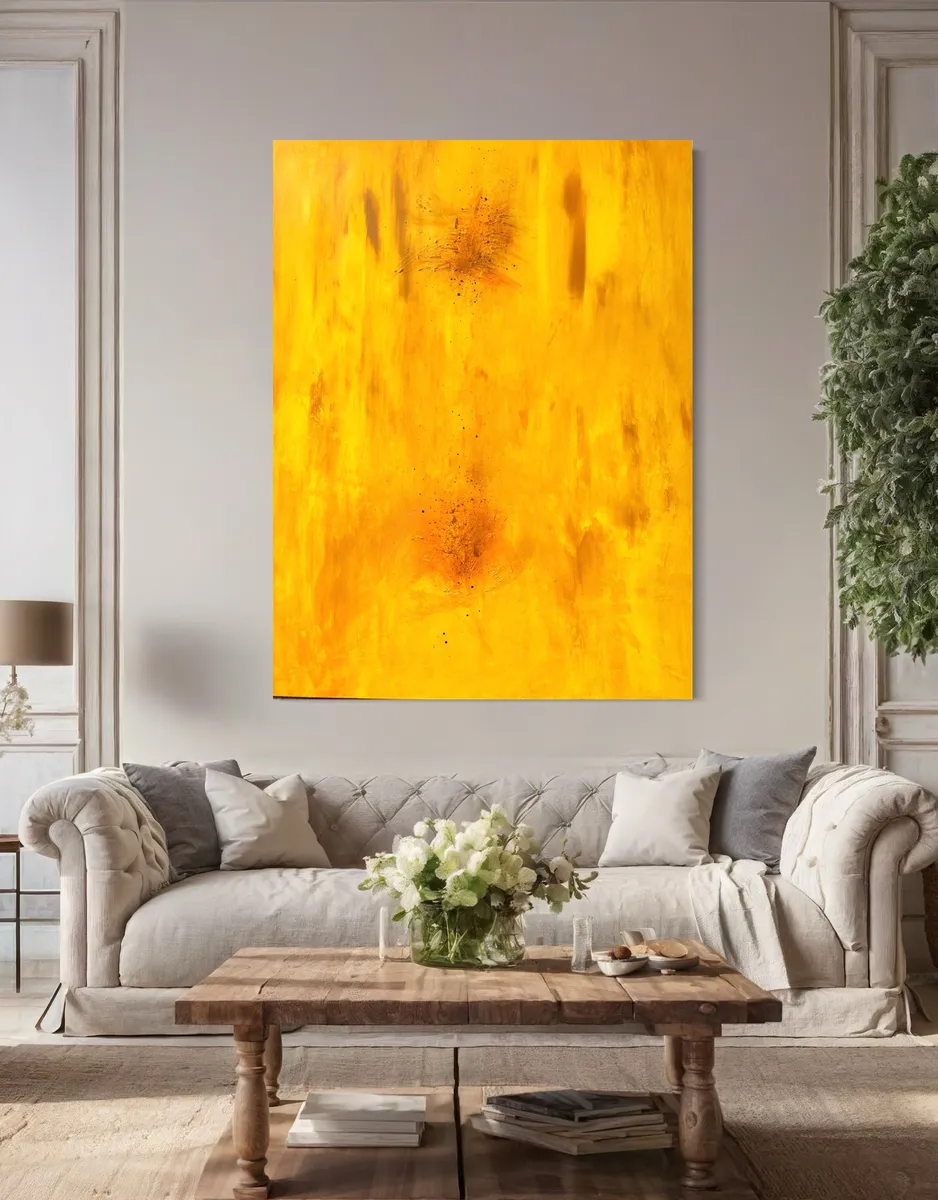 In the realm where color meets emotion, emerges a mesmerizing creation known as "Golden Crack." This enchanting masterpiece unveils a universe awash in the alluring embrace of vibrant yellow, where an ethereal dance of light and shadow plays out upon its textured surface. Imagine standing at the edge of sunrise, as golden hues cascade across the sky, unveiling the secrets of a new day. Within this enigmatic composition, swirls of reddish-brown hues weave a tale of contrast and intricacy, as if the very essence of the earth has risen to whisper stories of forgotten times. These circular motifs pulse with an ancient energy, drawing the viewer into a labyrinth of warmth and depth. Each brushstroke, a powerful stroke of alchemy, transforms the canvas into a dynamic tapestry that speaks the language of the soul. "Golden Crack" invites you to delve into the mysteries inspired by the radiant Norwegian summer. Here, the very spirit of nature’s palette is captured in golden tones that shimmer with an otherworldly glow. It is not just a painting, but a portal through which the boundless energies of the world are channeled, igniting the imagination and awakening the senses to the wondrous dance of creation.