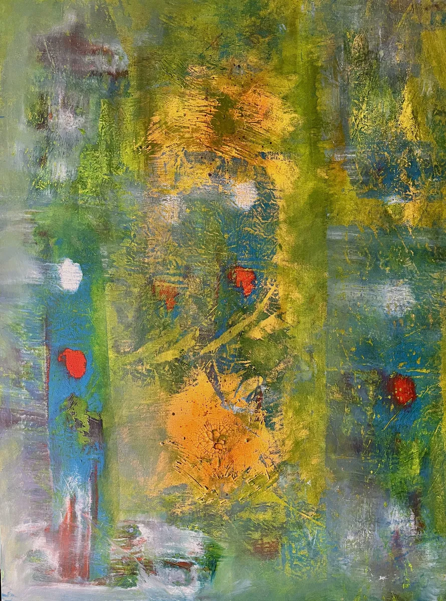 In the vibrant embrace of "North," we are swept into a transcendental landscape shaped by the spirit of nature's rebirth. A riot of colors unfurls across the canvas, weaving an intricate tapestry that pulses with the enigmatic beauty of northern springtime. Dominant greens, yellows, and blues merge and clash in dazzling harmony, each stroke a testament to the earth's vivacious renewal. Punctuations of red and white dance across the composition, akin to fleeting blossoms daring to peep through the verdant splendor. The canvas is a living, breathing entity, layered with textures that invoke the essence of the natural world in its most dynamic form. Whorls of paint surge forward in some areas, dense with untold stories, while elsewhere, translucent veils allow glimpses into the depths of the tapestry's soul. It is a visual symphony where chaos and tranquility coexist, a snapshot of the relentless dance of creation. Inspired by the raw and untamed beauty of northern Norway, "North" serves as an invitation to journey beyond the ordinary confines of perception. It draws us into a realm where color and texture are the dialects of an ancient tongue, where every hue resonates with the earth's eternal cycles. Here, in the abstract embrace of vivid tones, lies an echo of the wilderness—spontaneous, untethered, yet profoundly harmonious. Through this work, we are beckoned to lose ourselves in the rhythm of nature's infinite song, to discover the mysteries that lie hidden beneath the northern lights' eternal gaze.