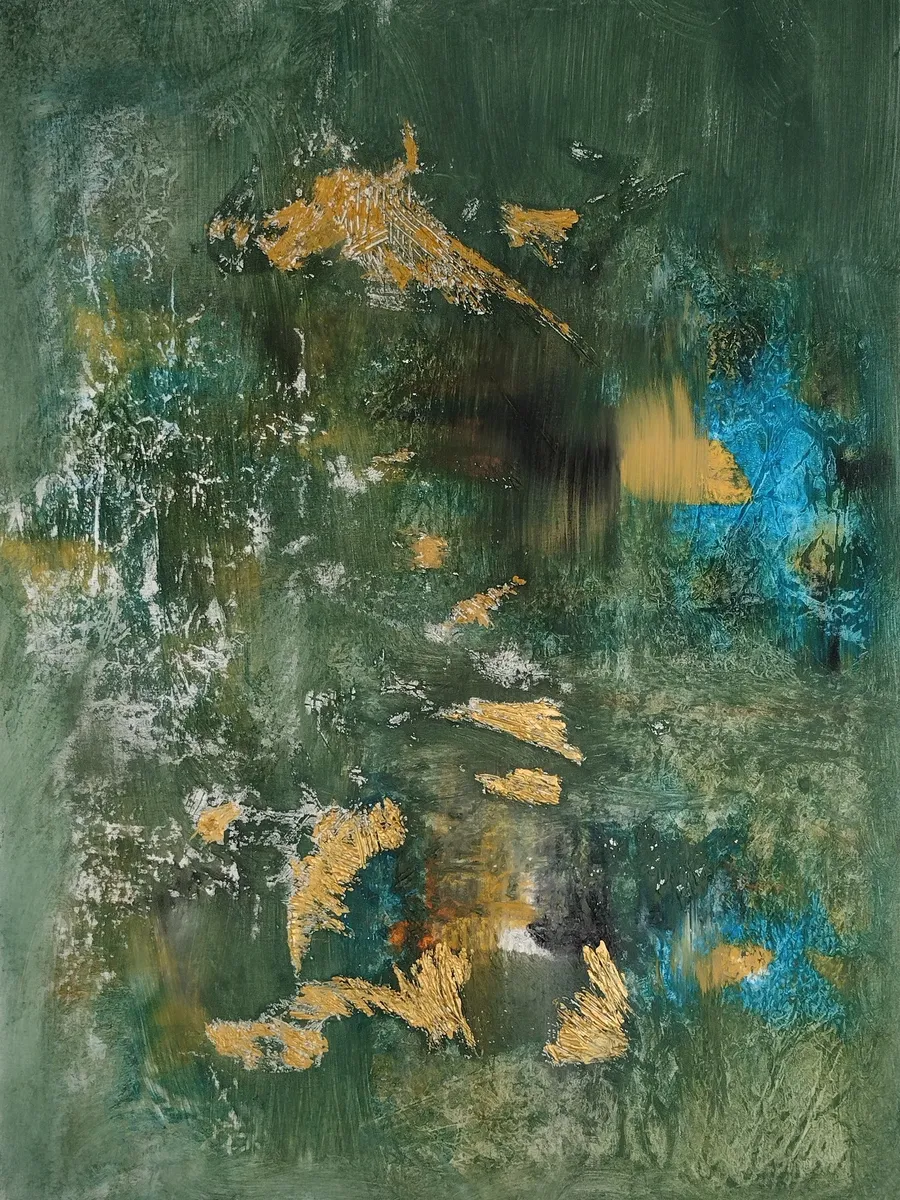 Summer is an abstract work defined by a harmonious blend of warm earth tones and cool accents. Shades of ochre and brown form the foundation, softly merging with cool blues and subtle hints of green to create a textured surface that suggests natural elements without outlining specific shapes. The paint’s weathered texture adds depth and movement, inviting viewers to wander through the layered visual fields. Vibrant patches of red disrupt the composition’s upper right corner, introducing a striking contrast that energizes the calm, atmospheric mood. The piece captures the essence of a Norwegian summer—its fleeting light and shifting landscapes—offering a contemplative experience rooted in nature’s subtle complexity.