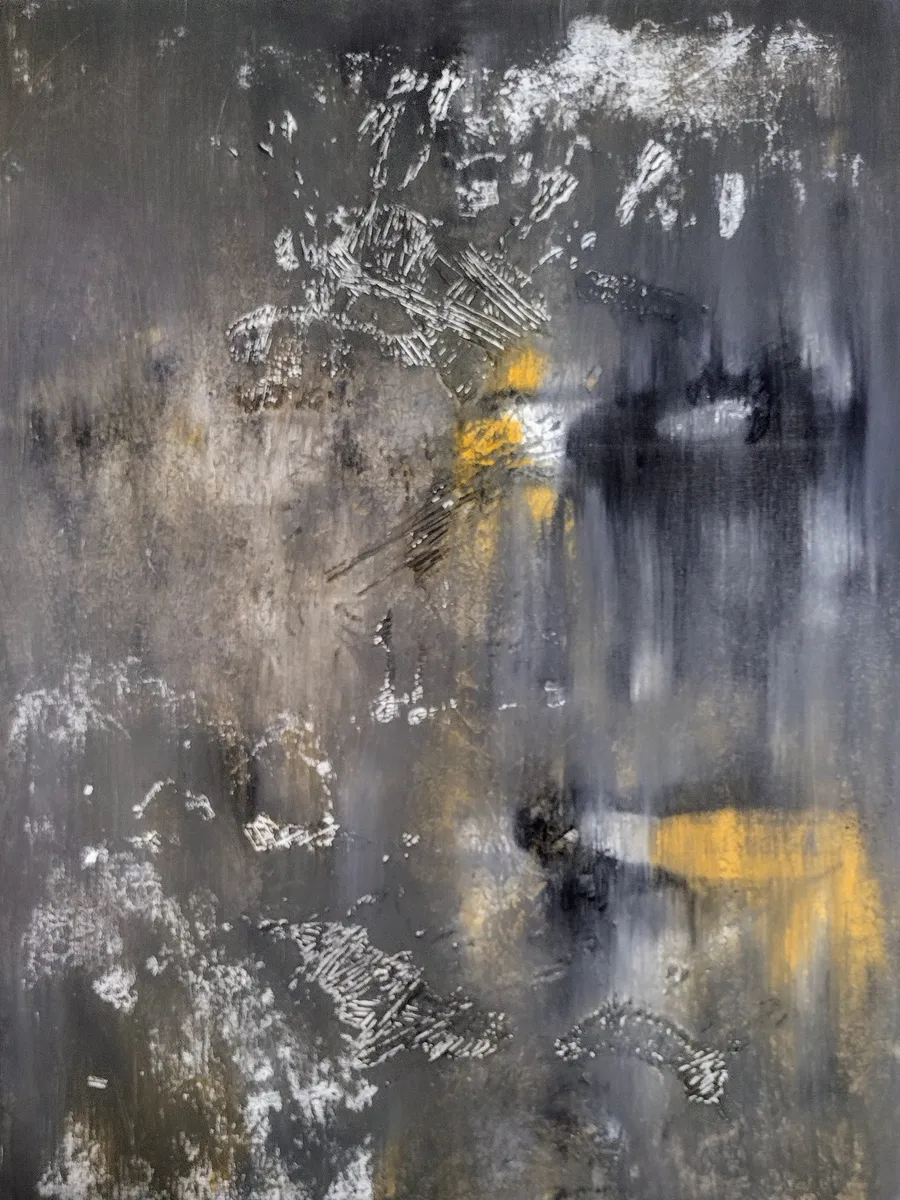Greenish-blue is an abstract exploration of color and movement, where soft green and blue hues merge seamlessly with striking bursts of yellow and orange. The palette evokes a cool, calm atmosphere that shifts dynamically as the eye moves across layered brushstrokes and textured surfaces. These tactile elements create depth, inviting a closer look at the subtle interactions between light and shadow throughout the composition. Inspired by the interplay of sky and sea along Norway’s coast, the piece captures a fleeting moment of natural harmony—both tranquil and charged with energy—offering a space where color and form engage in a quiet, compelling dialogue.
