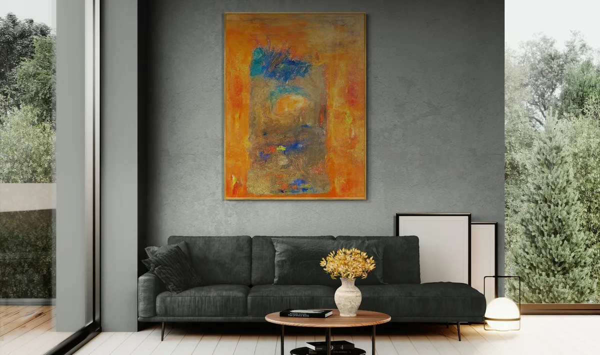 Dawn4U is a vibrant exploration of color and texture, where warm orange tones generate a radiant, inviting atmosphere. At the heart of the composition, a vertical band of varied textures and hues offers contrast and complexity, punctuated by striking patches of blue near both the top and bottom. These cooler accents create a dynamic interplay against the dominant warmth, drawing the eye through subtle shifts and layered brushwork. The surface invites close inspection, revealing an intricate layering that adds depth and a tactile quality to the piece. Inspired by the natural light and seasonal energy of Norwegian summers, this work captures an organic, atmospheric mood that balances bold color with thoughtful movement, inviting viewers to experience a sense of renewal and quiet intensity.