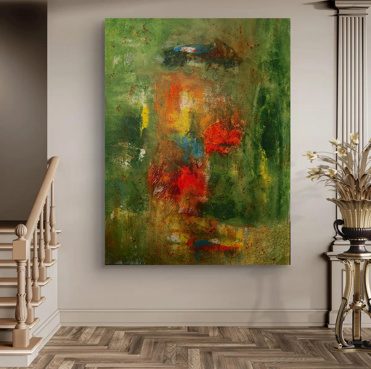 Northern Flames presents an abstract arrangement anchored by a richly textured green background that sets a contemplative tone. At its heart, bold swaths of red and orange ignite the composition, punctuated by subtle touches of yellow and blue that add layers of complexity. The brushwork is vigorous and uneven, creating a tactile surface where colors blend and collide with a sense of intentional spontaneity. This interplay between natural hues and dynamic strokes evokes the shifting moods of northern landscapes and the elusive quality of light, balancing tension and flow throughout. The piece draws viewers in, encouraging an exploration of its vibrant contrasts and the emotional resonance embedded within its layered forms.